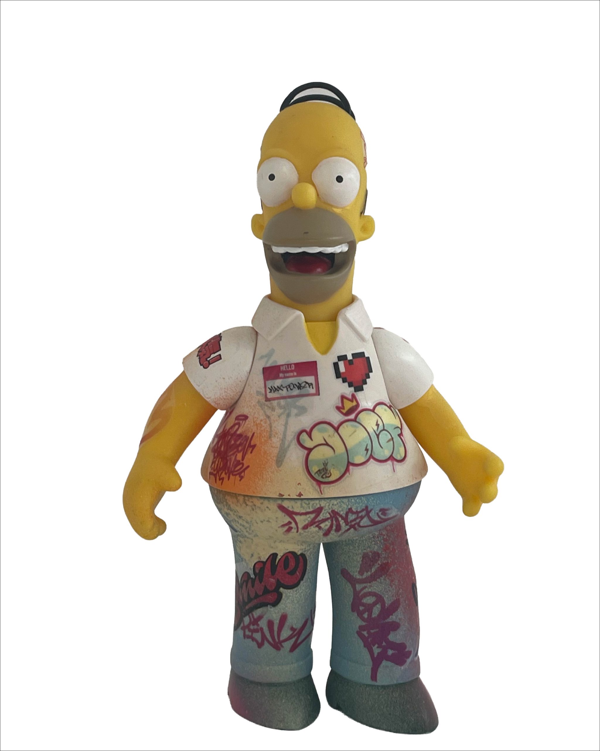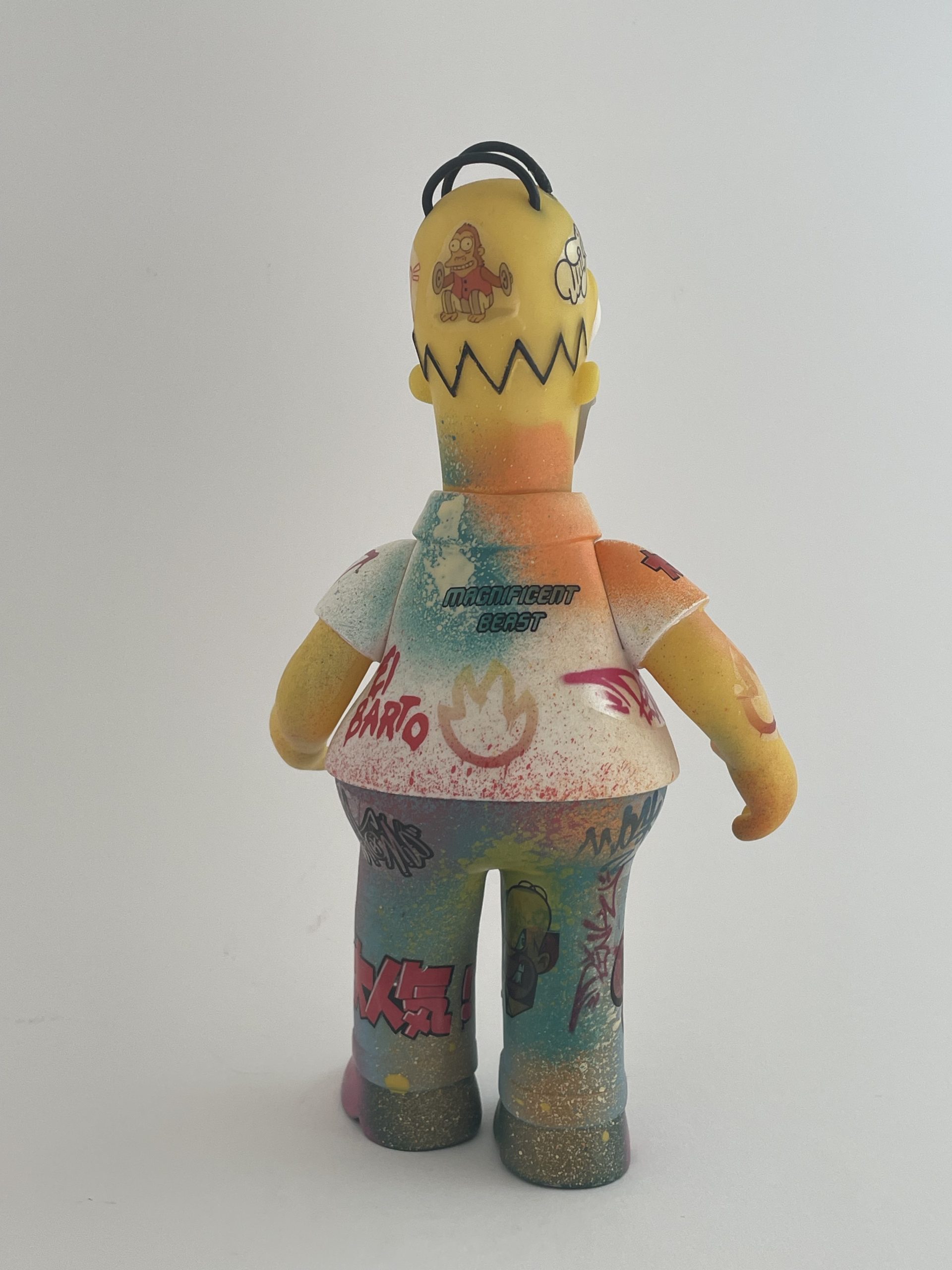 This hand-finished 7 inch tall Homer Simpson figurine is reworked with spray paint and graffiti, blending pop culture nostalgia with contemporary street art.